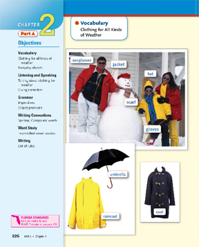 After the Objectives, new Vocabulary is introduced pictorially, orally, and in written form.