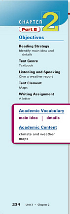 Each Chapter Part B section consistently presents Academic Vocabulary, Reading Strategy, Text Genre, and Text Element in conjunction with a reading passage.