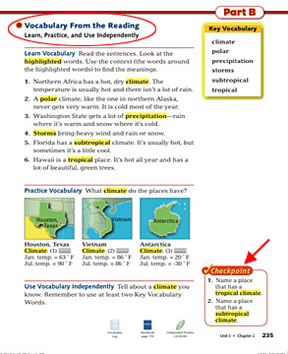 Note the Checkpoint at the bottom of the page. You and your students can determine their mastery of the vocabulary prior to moving on to the reading passage.