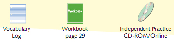 In this case, the students will add the new vocabulary words to their Vocabulary Log, do the Milestones Workbook with FCAT Preparation activities on page 29, and use the corresponding section of the Independent Practice CD-ROM.