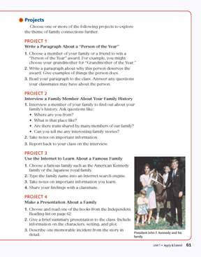 The Projects page is a listing of 3 or 4 activities which allow your students additional opportunities to apply and extend their new knowledge and skills.
