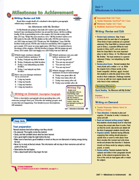 The final activity of each Unit is the Milestones to Achievement. By reviewing the Study Skills at the bottom of the Milestones Florida Teacher’s Edition pages, you help prepare your students for the end-of-unit assessment.