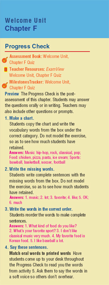 The Teacher's Edition notes detail how to implement the Progress Check, with references to the important Assessment Book, Teacher's Resource CD-ROM and MilestonesTracker Online Assessment and Remediation System which are used at this point in the program.
